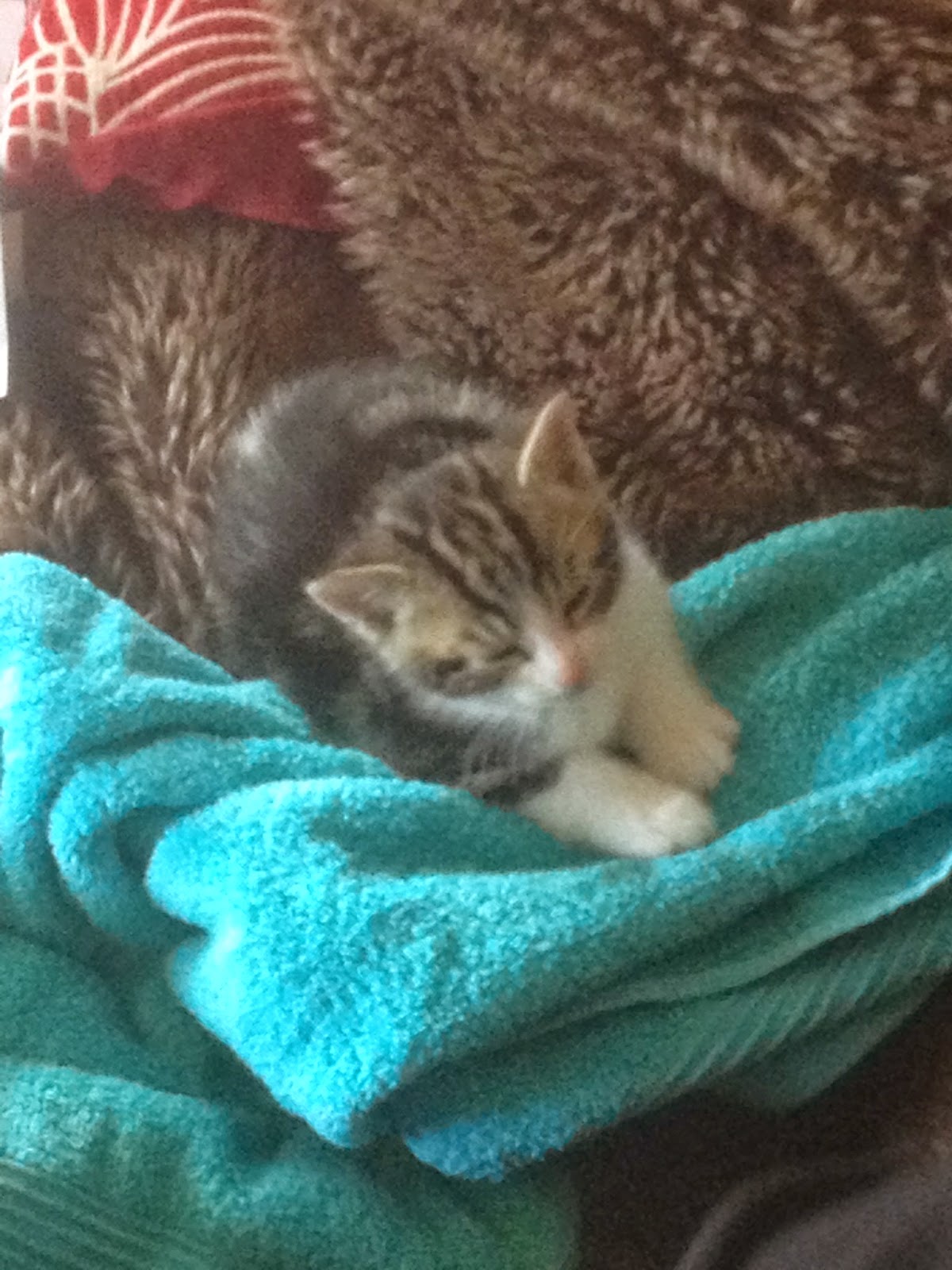 The kitten was understandably nervous, but she quickly settled in, eating wet kitten food under the watchful eye of her new owner, Zac. She was showered in blankets and warmth, and spent most of the rest of the day sleeping. Bobby Bobcat was not impressed, hissing loudly at his first sight of the new intruder. He was fussed with tuna, and then we moved him to another room. The new kitten was proving to be very popular. Several visitors came and went, and more than one remarked ‘what big feet it has’.