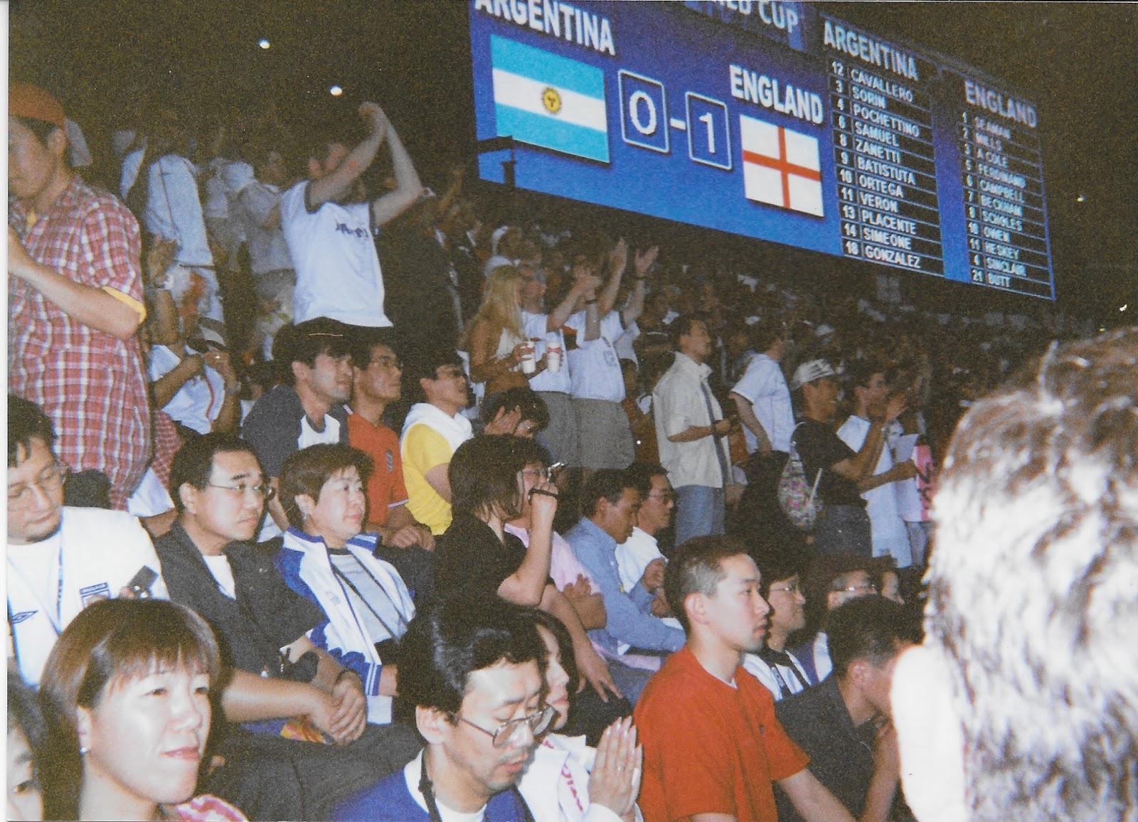 The Scottish couple had actually threatened to sell their tickets on the black market as they weren’t really interested in English football, but the atmosphere overtook them as they lustily joined in with “There’s Only One David Beckham” and as kick off approached they were as keen as the rest of us. I don’t need to tell you what happened in the game, in fact it is often better to watch on television than in the stadium as it gives you the bigger picture, but what you do get in the stadium is an intensified experience. You may have been a little nervous as Becks stepped up to take his penalty, I could barely look. I left my seat as the ball hit the back of the net and I landed on the row behind, in the laps of two Japanese men wearing Argentina shirts. This was probably even harder to take for them as I was wearing a Brazil shirt at the time. You may have been a little nervous as the Argentinians piled on the pressure, I have no finger nails left. The final whistle went and the place erupted.. The Argentina fans had been quiet for most of the evening, and now they trudged away in silence. In a bizarre twist the stadium announcer actually announced the result of the match, as if no one actually knew it. We seemed to be walking on air out of the stadium and back to our coach, but that was just the start of a night of celebration. All the way back to the city centre our coach was mobbed by adoring Japanese fans, unconcerned that we were just fourteen England fans, and they mobbed us as if we were the team itself.